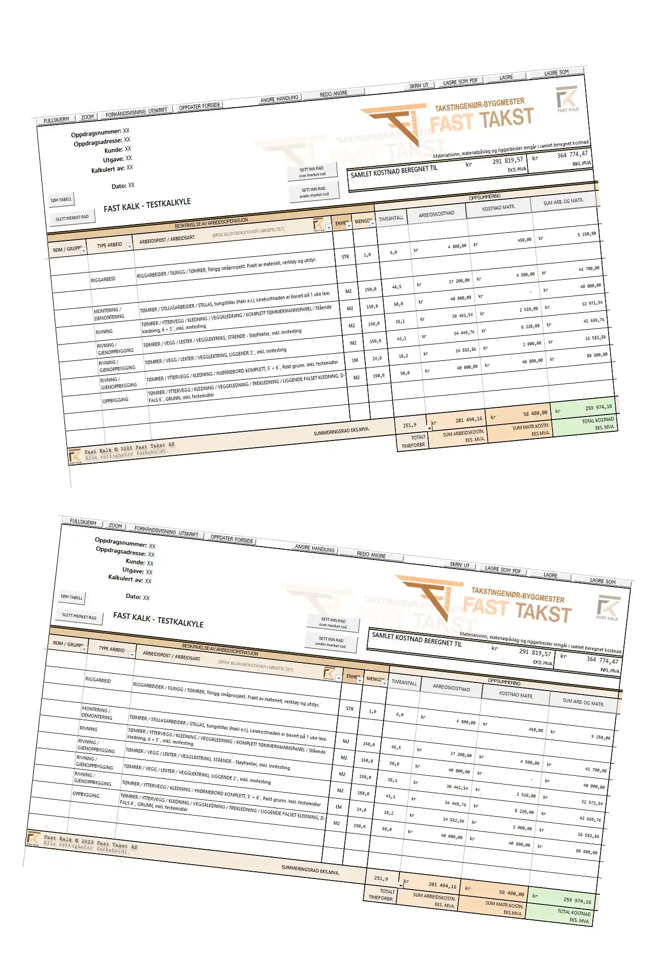 Fast Kalk er et profesjonelt kalkulasjonsverktøy for bygningsoppdrag, utviklet for bygg- og takstbransjen. Verktøyet er laget for å gjøre beregninger av byggeprosjekter enklere, raskere og mer presis, uansett prosjektstørrelse. Systemet samler erfaring, struktur og kalkulasjonslogikk fra hundrevis av tidligere prosjekter i én komplett arbeidsbok. Fast Kalk erstatter behovet for å lage nye regneark for hvert oppdrag, og gir i stedet et helhetlig og fleksibelt verktøy som dekker alt fra enkle rehabiliteringsjobber til større byggeprosjekter.